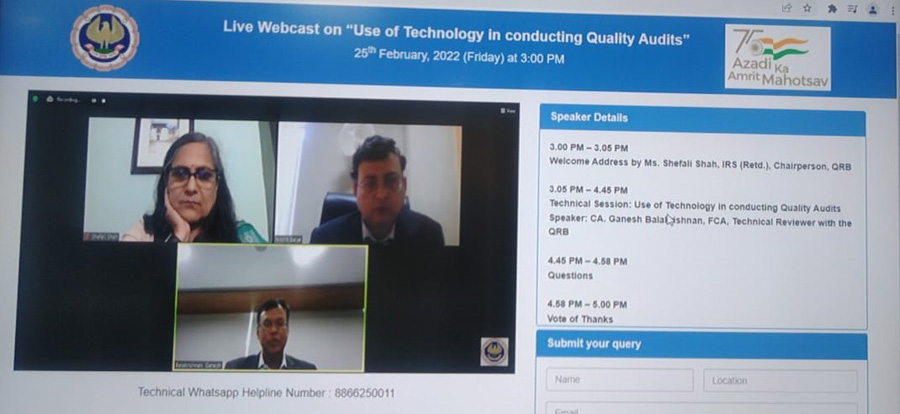 Azadi Ka Amrit Mahotsav – Live Webcast on Use of Technology in conducting Quality Audits held on 25.02.2022[Gallery not found] Live Webcast on Audit Quality Review – Key Learnings on 19.02.2020.[Gallery not found] Live Webcast on “How to conduct Audit Quality Review” for the Technical Reviewers empanelled with the Quality Review Board at 3 PM on Monday, 21st January, 2019 at New Delhi[Gallery not found] Workshop on Overview of Audit Quality Review organised by Bhubaneswar Branch of EIRC of the ICAI on 26.08.2016 at ICAI Bhawan, Bhubaneswar[Gallery not found] Workshop on Quality Review Board hosted by Hyderabad Branch of SIRC of the ICAI on 23.1.2015 at ICAI Bhawan, Hyderabad[Gallery not found] Interactive meeting with the Technical Reviewers empanelled with the Quality Review Board held on 5.11.2014 at ICAI Bhawan, A-29, Sec. 62, NOIDA.[Gallery not found] Workshop on Quality Review hosted by Hisar Branch of NIRC of the ICAI held on Saturday, 31st August, 2013 at Hisar[Gallery not found] Interactive meeting of the Members of the Quality Review Board with the Audit Firms held on Monday, 20th May, 2013 at 1.30 PM in the India Habitat Centre, Lodhi Road, New Delhi- 110 003.[Gallery not found] Workshop on Quality Review Process organised by Ludhiana Branch of NIRC of the ICAI held on Monday, 6th May, 2013 at Ludhiana[Gallery not found] Interactive video-conferencing organized by the Quality Review Board on Saturday, 20th April, 2013 at 11 AM at ICAI Bhawan, Indraprastha Marg, New Delhi and at ICAI’s Regional Offices at Mumbai, Chennai and Kolkata.[Gallery not found] Visit of a delegation of the QRB to the Certified Public Accountants and Auditing Oversight Board (CPAAOB), Japan at Tokyo on September 12, 2014Interaction on “Promoting Confidence in Corporate Reporting and Governance: Perspective of Quality Review Board” held on 5th March, 2011 at ICAI, Chennai.[Gallery not found] Interaction on “Quality Review of Audit Services of Audit Firms” held on 27th March, 2011 at ICAI, Kolkata.[Gallery not found] Workshop of the Quality Review Board Jointly with ICAI held on May 7, 2011 at India Habitat Centre, Lodhi Road, New Delhi.[Gallery not found] Workshop of the Quality Review Board organised by the ICAI on June 11, 2011 at ICAI, Chennai[Gallery not found] |